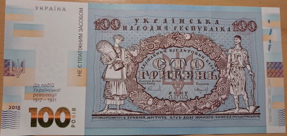 Сувенірна банкнота "Сто гривень" в сувенірній упаковці (до 100-річчя подій Української революції 1917 - 1921 років) Сувенірна банкнота `Сто гривень` відтворює дизайн української банкноти номінальною вартістю 100 гривень, введеної в обіг 17 жовтня 1918 року. Навесні 1918 року український уряд ухвалив рішення змінити назву вітчизняних грошей із `карбованців` на `гривні`, бажаючи підкреслити спадковість традицій державотворення з часів Київської Русі. Найціннішою з мистецького погляду була купюра номіналом 100 гривень, розроблена і виконана Г. Нарбутом, на якій зображено пишний вінок із квітів, плодів, овочів, пшениці. Обабіч стоять жінка в національному вбранні зі снопом пшениці та серпом у руці і чоловік у фартуху, що спирається на молот, обвитий лавром. Написи зворотного боку включено у великий картуш із рослинно-плодового орнаменту, а по боках - декоративні колони. Увінчує всю композицію тризуб, обрамлений лавровим вінком. Банкнота виготовлена на папері з водяним знаком (зображення тризуба). Її розміри: 80 х 170 мм.